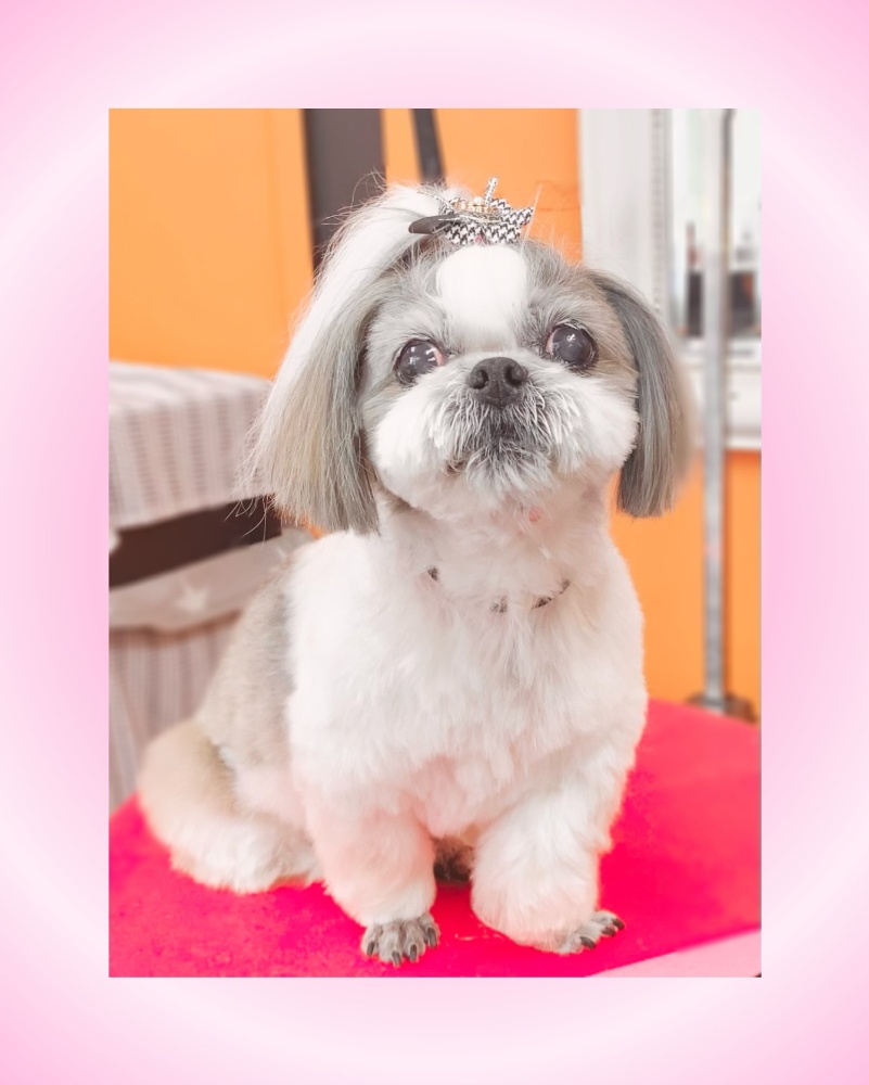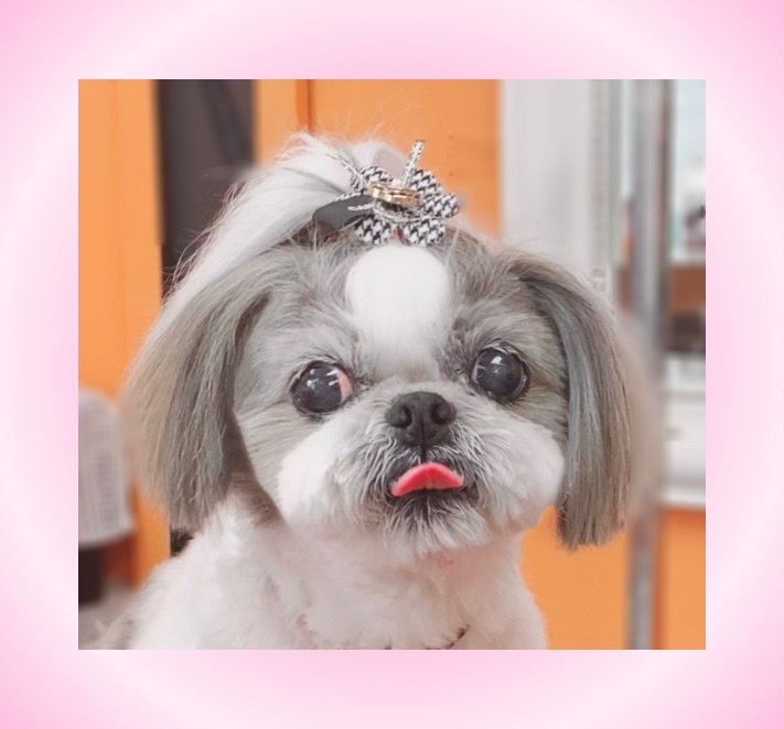 シーズー女の子サラちゃんトップノット女の子っぽくて可愛い〜身体5ミリバリカン手足先1ミリ手足✂️シッポ揃える程度✂️ふわふわ〜お耳短め✂️お顔マズルまーるく、目まわりスッキリ、顔横スッキリ✂️お目目キラキラ✨愛らしい💕本日もご利用ありがとうございました☆次回ご予約ありがとうございます✂️