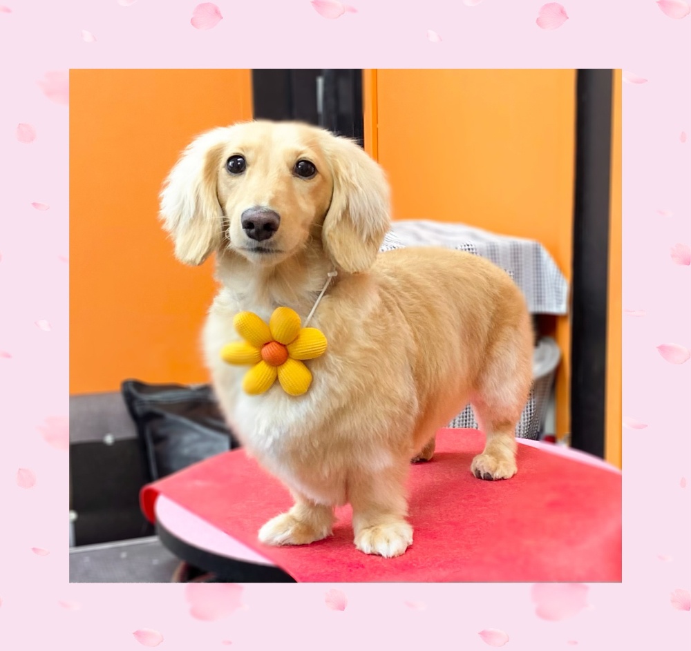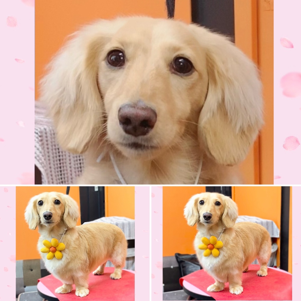 ダックスちゃん全体的に毛先✂️おとなしくて可愛い女の子みみんちゃん名前も可愛いねっ💕身体手足全体的に✂️シッポ身体と同じくらいスッキリ✂️お耳揃える程度耳縁✂️ふわふわな毛もスッキリ✂️ひとまわり小さくなりましたー本日ご利用ありがとうございました☆